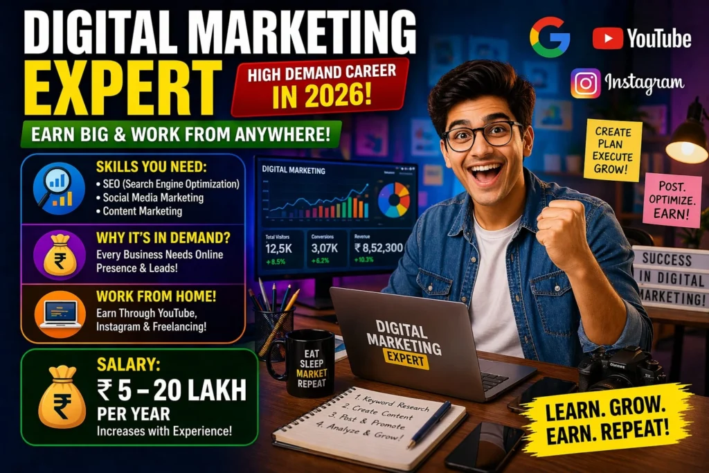 2026 में जिस तरह से डिजिटल मार्केटिंग आगे बढ़ रहा है चाहे हम गूगल की बात करें या यूट्यूब या अन्य सोशल मीडिया की इसकी डिमांड तेजी से बढ़ते जा रही है। डिजिटल मार्केटिंग में SEO (Search Engine Optimization), Social Media Marketing और Content Marketing आदि जैसे स्किल सिख के आप अच्छी खासी पैसे कमा सकते हो। इनके मदद से प्लेटफॉर्म जैसे YouTube और Instagram से आप घर बैठे भी पैसे कमा सकते हैं।