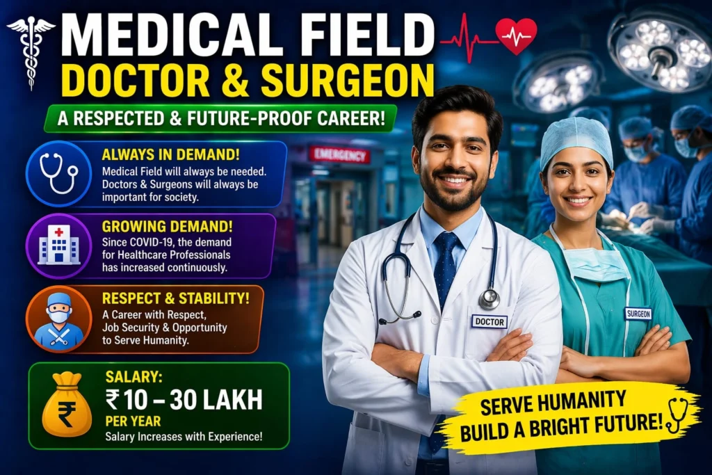 2020 में कोविद के बाद, मेडिकल फील्ड की डिमांड लगातार बढ़ते जा रही है। मेडिकल फील्ड एक ऐसे फील्ड है जिनकी डिमांड हमेशा रहेगी यानी की सम्मानजनक और स्थिर करियर रहा है। डॉक्टर और सर्जन की जरूरत हमें हमेशा रहेगी और इसकी डिमांड उल्टा बढ़ाते रहेगी।