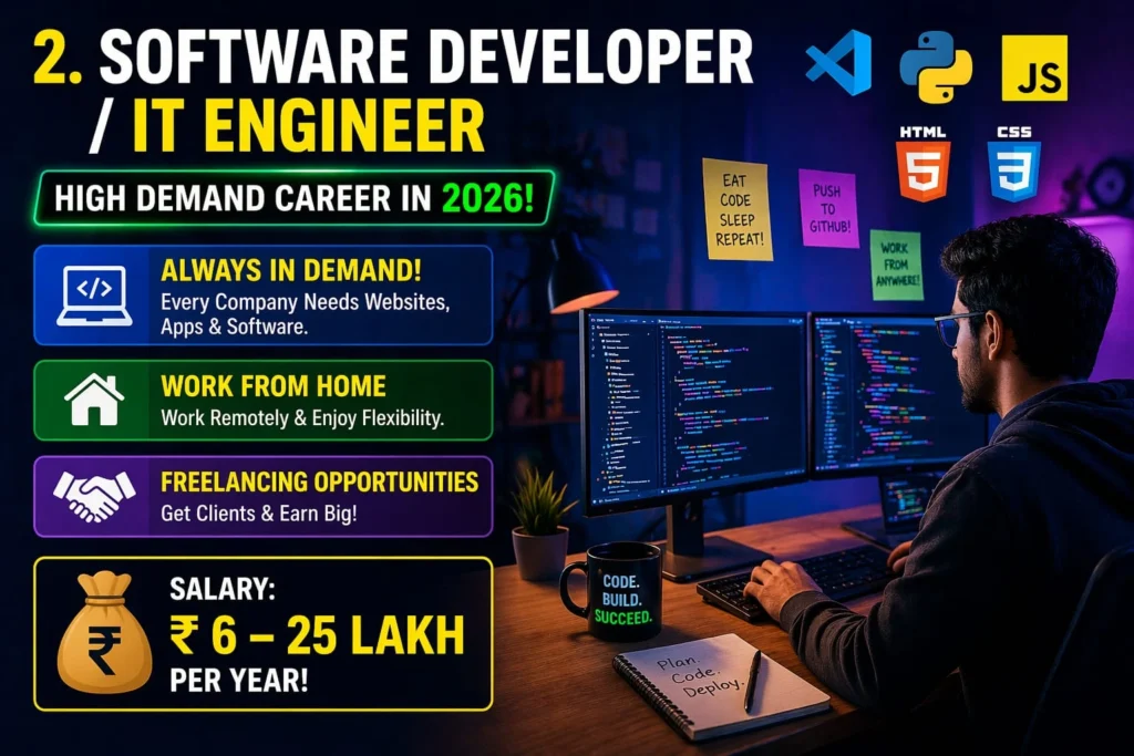 Software Developer / IT Engineer भी सबसे ज्यादा हाई डिमांड करियर के ऑप्शन में से आता है। इसकी डिमांड तेजी से बढ़ती जा रही है, अधिकतर कंपनियों को वेबसाइट, ऐप या सॉफ्टवेयर की जरूरत पड़ती ही है। इसकी एक बेनिफिट यह भी है कि आप घर बैठे काम कर सकते हो या फिर Freelancing के माध्यम से क्लाइंट को ले सकते हो।
