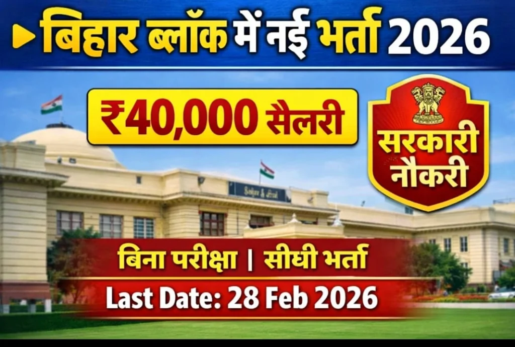 Bihar Block Vacancy 2026 के लिए 5 फरवरी 2026 से आवेदन प्रक्रिया शुरू होगी और 28 फरवरी 2026 तक आप इसके लिए आवेदन कर सकते हो।