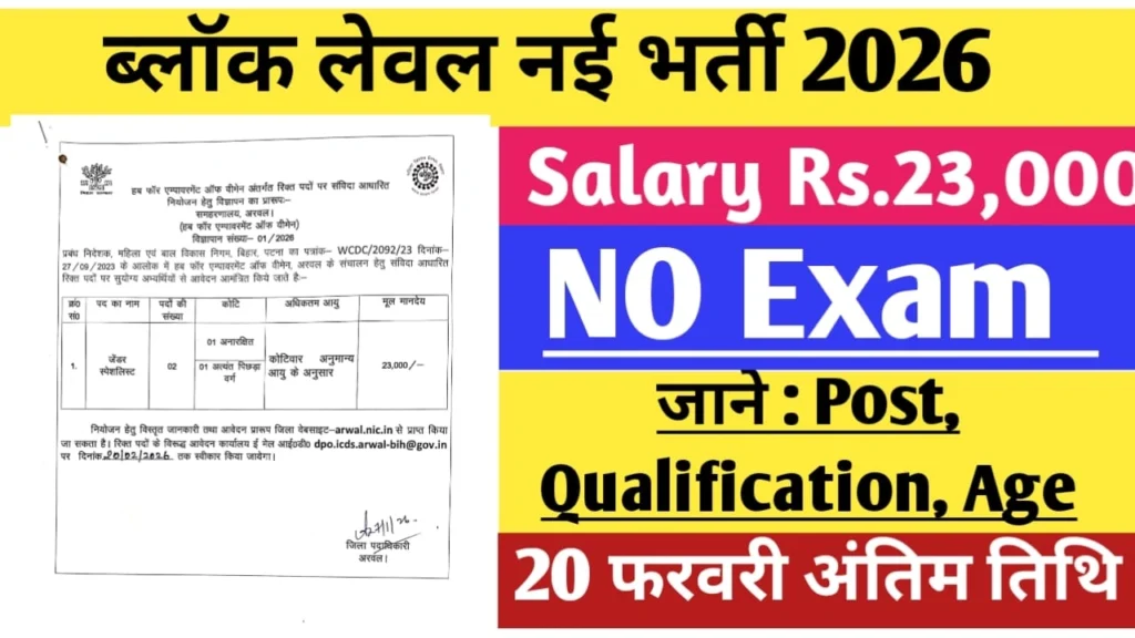 Bihar Block Level Recruitment 2026 के लिए दो बड़े पद जेंडर स्पेशलिस्ट के लिए निकल गई है। Bihar Block level Bharti 2026 के लिए आपको ईमेल आईडी के माध्यम से आवेदन प्रक्रिया करनी होगी और अंतिम तिथि आवेदन करने के लिए 20 फरवरी 2026 बताई गई है। Bihar Govt Vacancy 2026 के बारे में जानने के लिए या फिर Bihar Block Level Recruitment 2026 Notification PDF को डाउनलोड करने के लिए आर्टिकल को आखिरी तक पढ़ने का प्रयास करें।