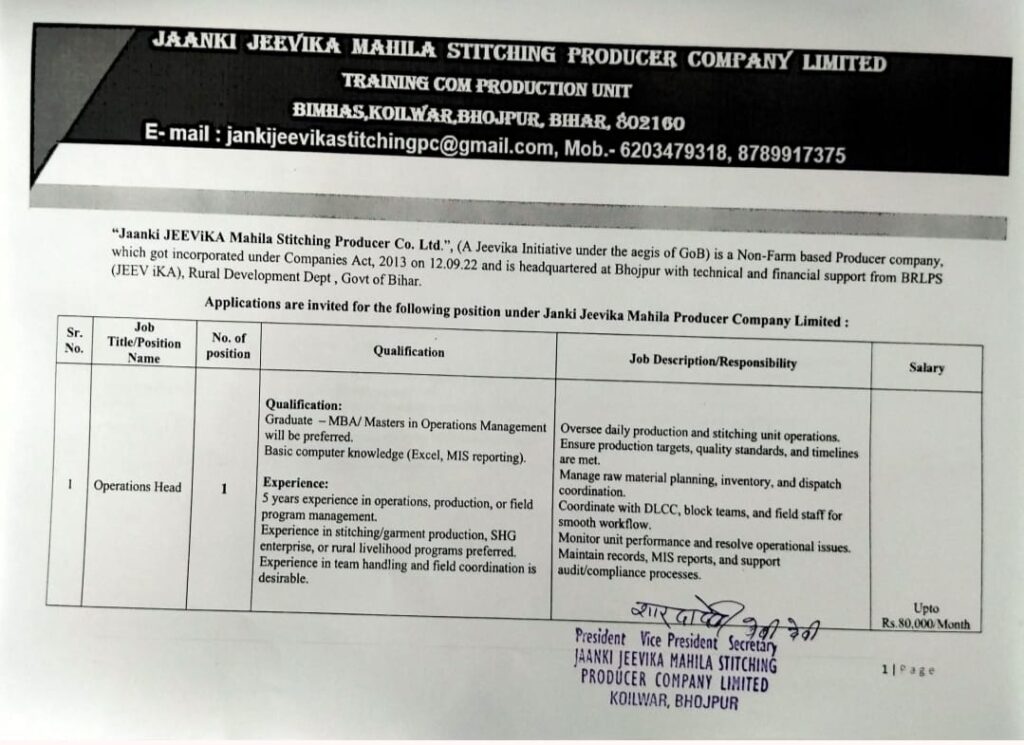 जानकी जीविका महिला स्टिचिंग प्रोड्यूसर कंपनी लिमिटेड की ओर से 10 मार्च को ही Janki Jeevika Mahila Producer Company Limited Vacancy 2026 Notification PDF जारी कर दिया गया है, जहां पर अलग-अलग पदों के लिए अलग-अलग क्वालिफिकेशन के साथ सैलरी भी भी अलग-अलग बताई गई है।