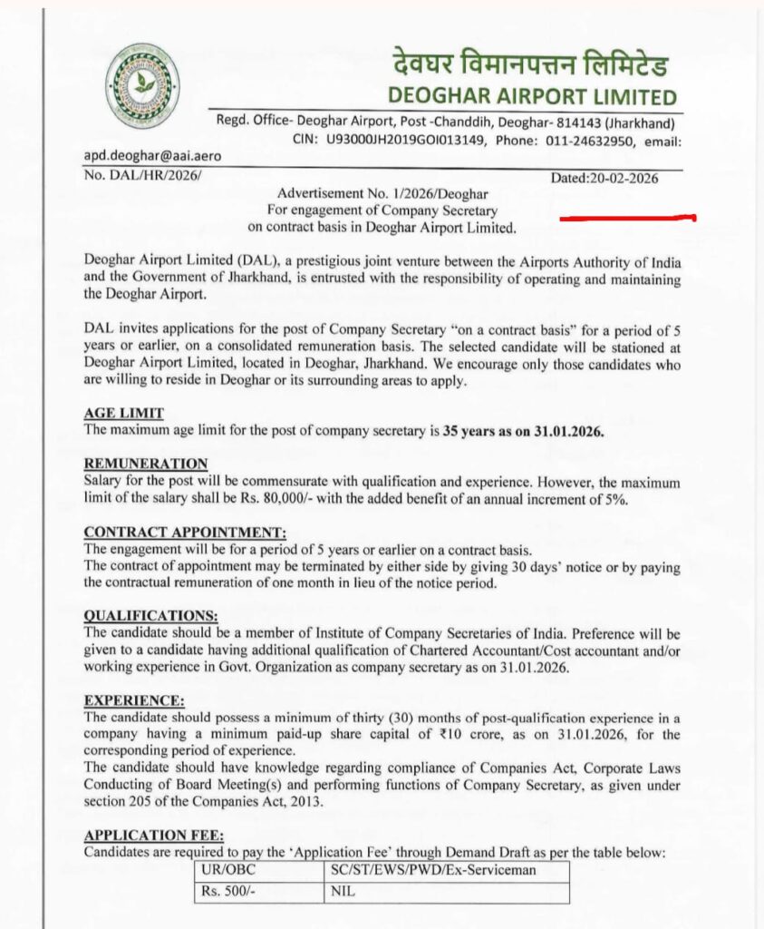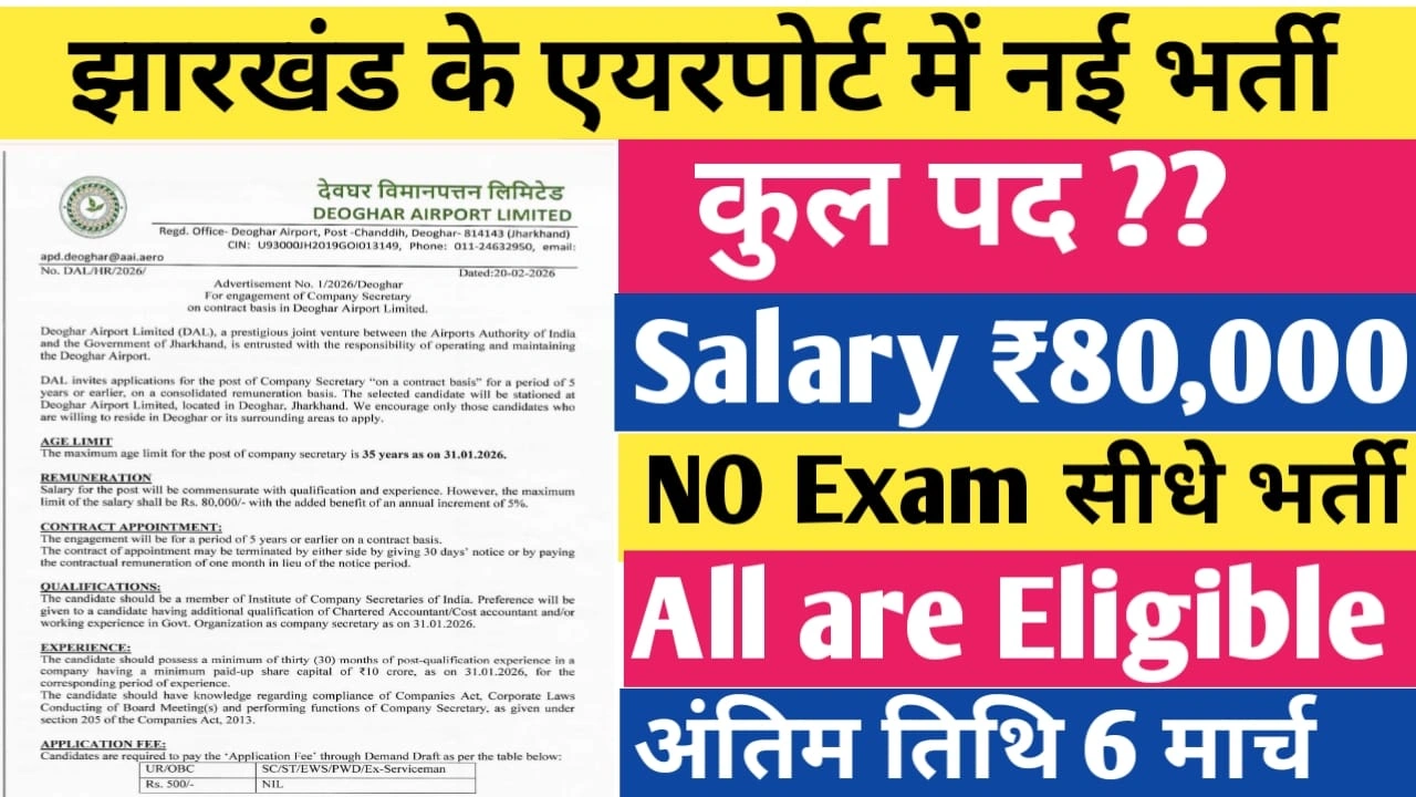झारखंड के देवघर जिले से Deoghar Airport New Vacancy 2026 को लेकर सूचना 20 फरवरी को ही पब्लिश किया गया है, जहां पर विज्ञापन संख्या 1/2026/देवघर के तहत बताया गया है कि Company Secretary के लिए पद निकाले गए हैं। Airport Recruitment 2026 के लिए 5 साल के कॉन्ट्रैक्ट बेस पर निकाली गई है, जिसकी आवेदन करने की अंतिम तिथि 6 मार्च 2026 तक समय दिया गया है।