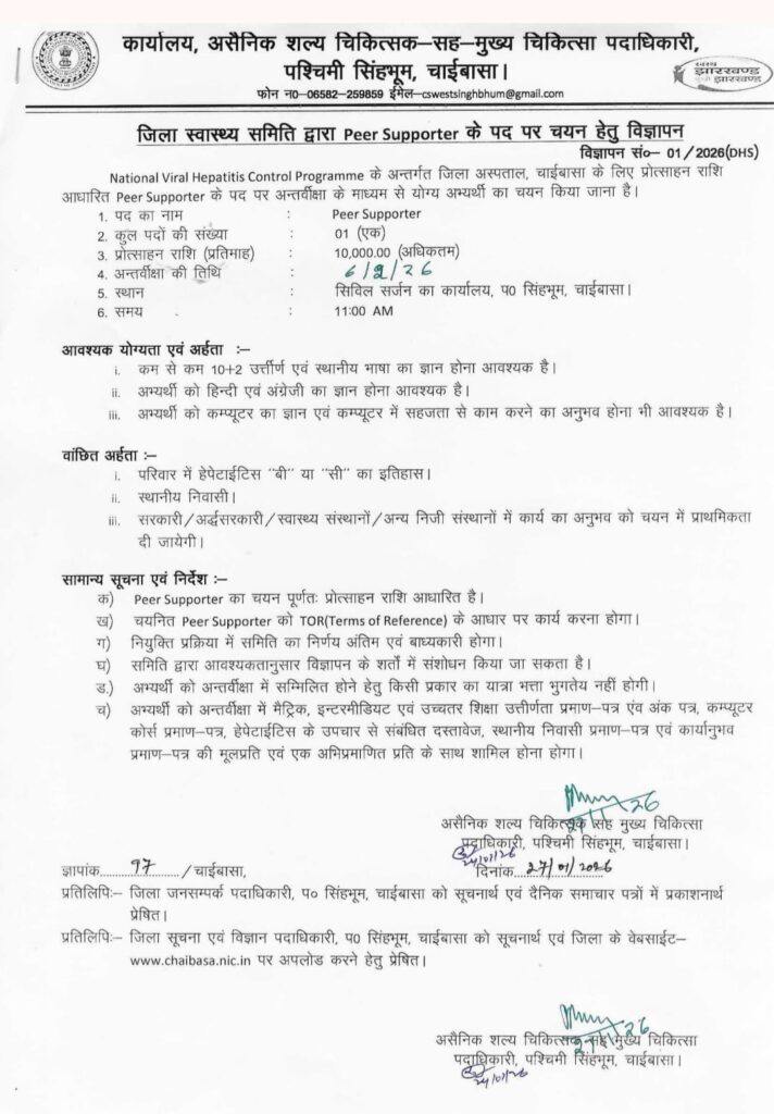 Jharkhand Block Level Vacancy 2026 : नमस्कार दोस्तों आज हम Jharkhand New Bharti 2026 के बारे में बात करने वाले हैं। झारखंड के चाईबासा जिले से कार्यालय, असैनिक शल्य चिकित्सक-सह-मुख्य चिकित्सा पदाधिकारी के द्वारा National Viral Hepatitis Control Programme के अन्तर्गत जिला अस्पताल, चाईबासा के लिए Peer Supporter की पद की घोषणा की गई है।