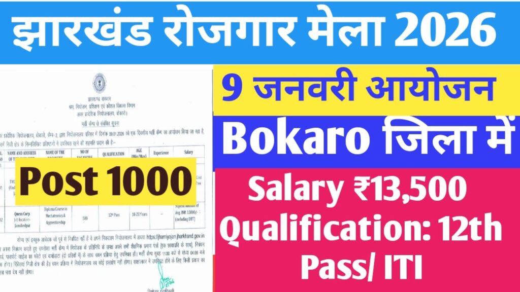 Jharkhand Bokaro Rojgar Mela 2026 : नमस्कार दोस्तों नए साल की शुरुआत में ही झारखंड सरकार के द्वारा बोकारो रोजगार मेला का आयोजन शुरू करने वाली है। जी हां, झारखंड के जिले बोकारो में कंपनी के द्वारा लगभग 1000 पदों के लिए, ये नोटिफिकेशन जारी कर दिया गया है। 9 जनवरी 2026 को Jharkhand Rojgar Mela 2026 का आयोजन होने वाला है।