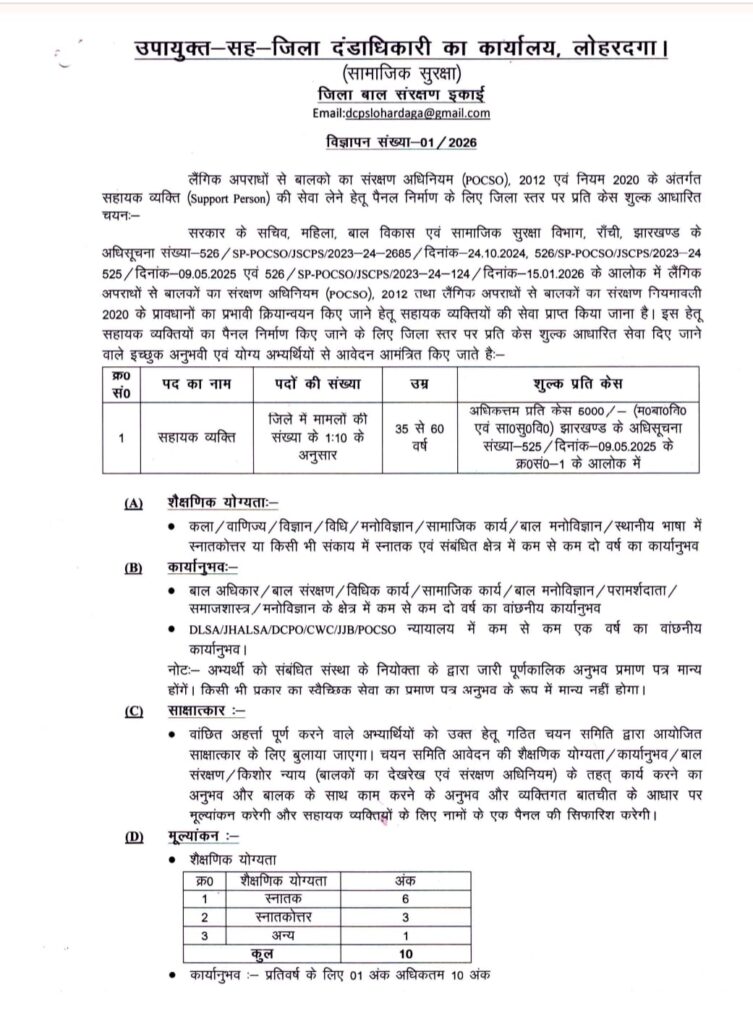 झारखंड के लोहरदगा जिले से सहायक व्यक्ति के लिए नोटिफिकेशन जारी की गई है। जहां पर बताया गया है कि जिले में मामलों की संख्या के 1:10 के अनुसार पदों की संख्या बताई गई है। 12 मार्च को ही इसके ऑफिशल नोटिफिकेशन जारी की गई है, और अंतिम तिथि आवेदन करने की 11 अप्रैल 2026 बताई गई है।