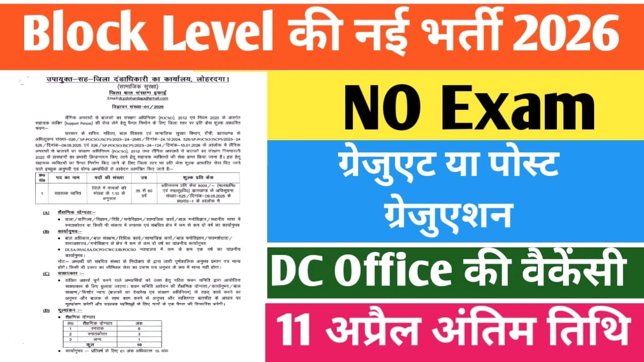 Jharkhand Block Level Vacancy 2026 Notification PDF 12 मार्च को ही जारी कर दिया गया है, प्रतिकेश के हिसाब से इसकी सैलरी निर्धारित की जाएगी। उम्मीदवारों के पास ग्रेजुएट या फिर पोस्ट ग्रेजुएशन की डिग्री है, वे इसके लिए आवेदन कर सकते हैं। Jharkhand Lohardaga Bharti 2026 के आवेदन करने के लिए आप झारखंड के निवासी हैं या किसी भी जिले से हैं, आप इसके लिए आवेदन कर सकते हैं। उम्मीदवार कृपया ध्यान दें, अंतिम तिथि आवेदन करने की 11 अप्रैल 2026 बताई गई है। Jharkhand Lohardaga Bharti 2026 के बारे में जानने के लिए आर्टिकल को अंत तक पढ़ने का प्रयास करें।