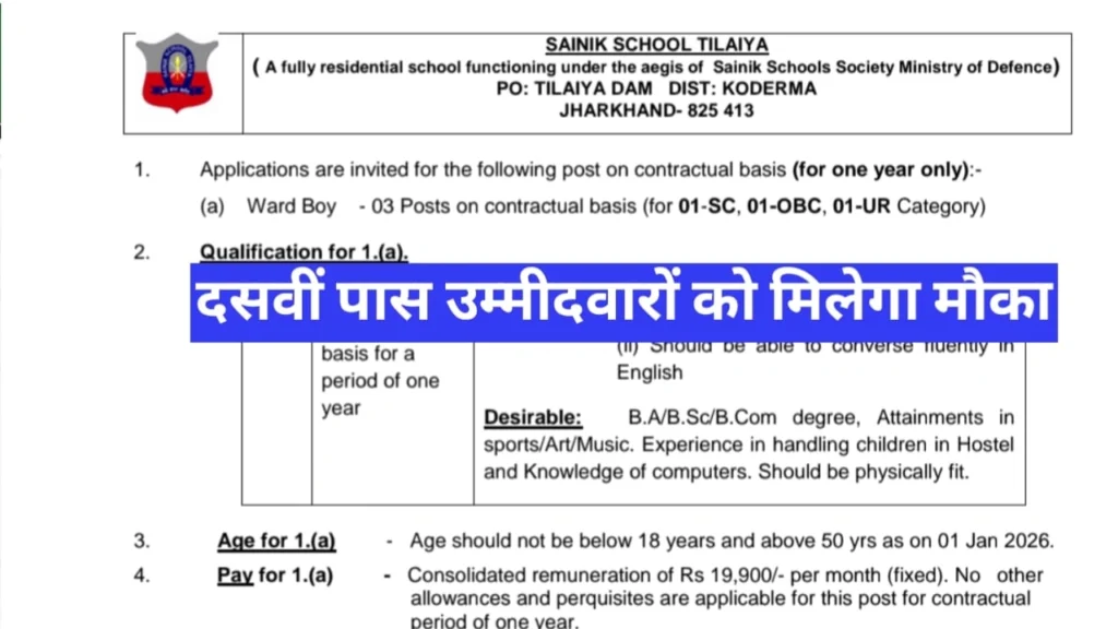 Sainik School Tilaiya Vacancy 2026 : Sainik School Tilaiya ने कॉन्ट्रैक्ट बेस पर Ward Boy की नई भर्ती निकाली गई है। झारखंड के कोडरमा में स्थित Sainik School Tilaiya के द्वारा तीन बड़े-बड़े पदों की नोटिफिकेशन जारी की गई है।